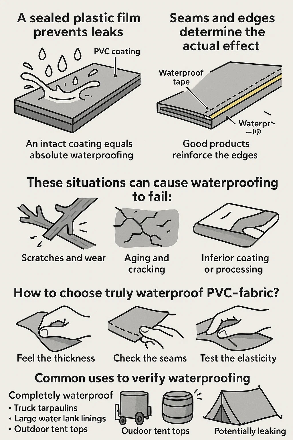Lapisan yang utuh sama dengan kedap air mutlak: Selama lapisan PVC masih utuh, lapisan tersebut akan menghalangi hujan, cipratan, dan pencairan salju, seperti halnya air dalam ember plastik.
