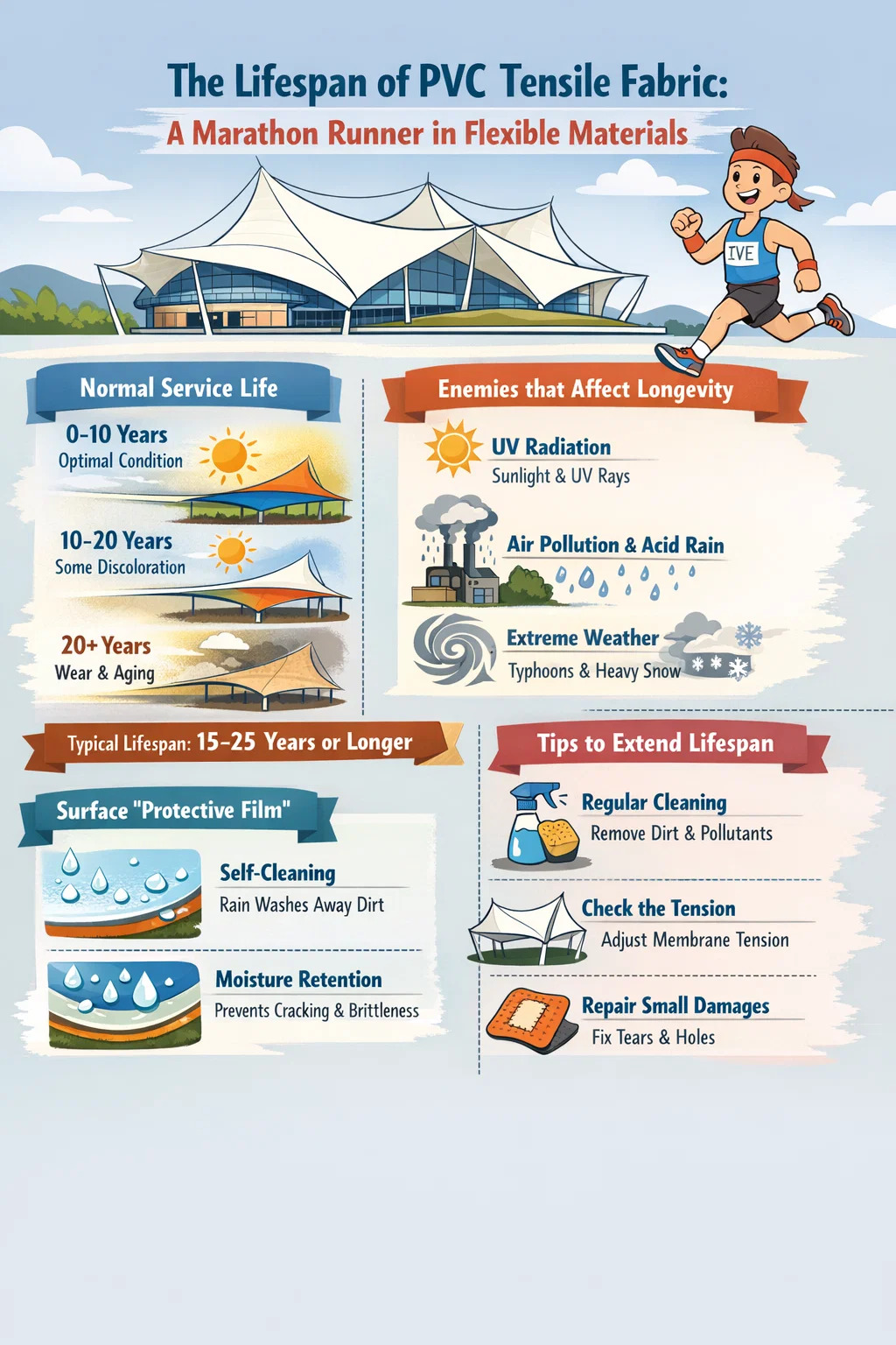 Dalam perawatan normal, struktur kain tarik PVC berkualitas tinggi biasanya dapat bertahan selama 15 hingga 25 tahun, atau bahkan lebih lama.